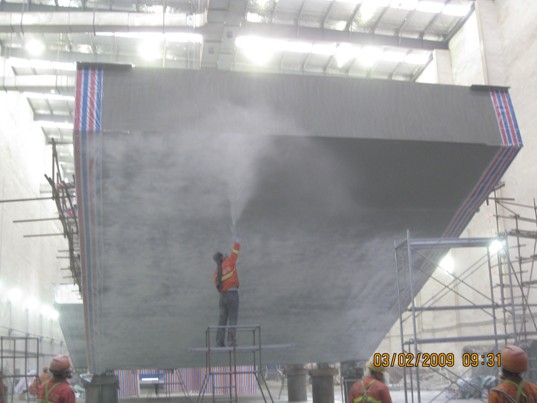 圖中為美國海灣大橋的分段底漆后的面漆霧噴施工,要求膜厚25-50微米